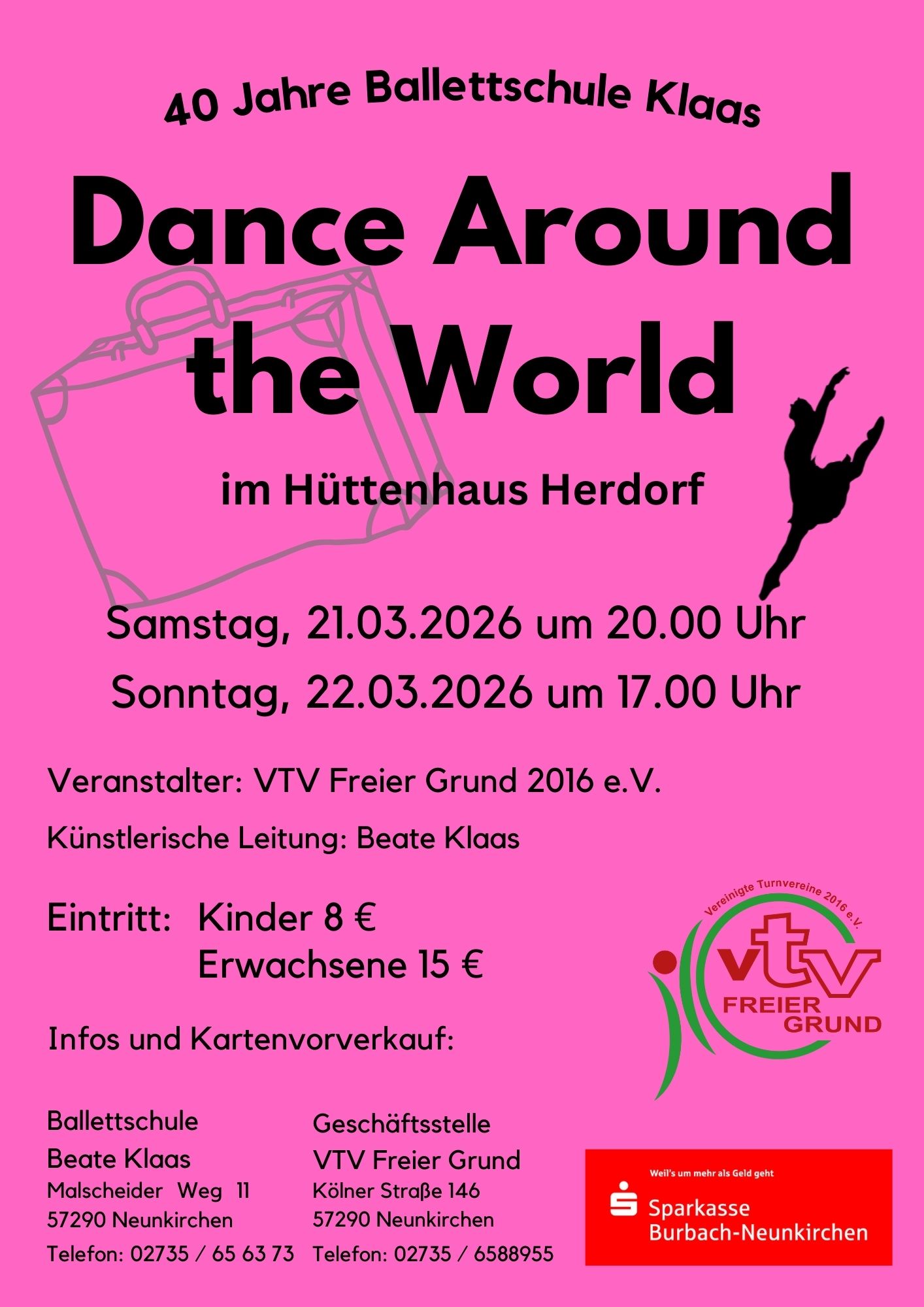 Die Tanzshow präsentiert der VTV Freier Grund unter der Leitung von Beate Klaas am 21. und 22. März 2026 im Hüttenhaus Herdorf. Kinder und Jugendliche verschiedener Altersgruppen zeigen Choreografien aus unterschiedlichen Stilrichtungen – von klassischem Ballett über Modern Dance bis hin zu weiteren tänzerischen Einflüssen aus aller Welt.